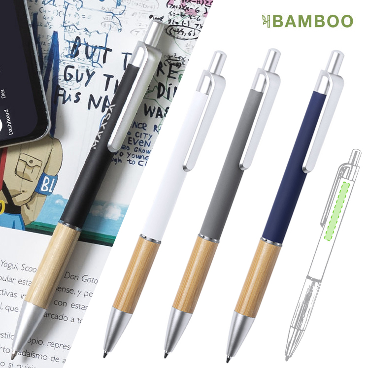 Bolígrafo de línea nature y mecanismo pulsador. De elegante diseño, con cuerpo en aluminio de acabado mate y empuñadura en bambú, con accesorios en acabado mate. Clip de acabado metalizado y anilla transparente, en tinta azul. Disponible en variada gama de colores.