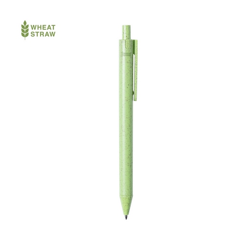 Bolígrafo de línea nature con mecanismo pulsador. Cuerpo en caña de trigo y PP, para así fomentar la utilización de materias primas naturales y reducir las emisiones contaminantes. Clip con amplia superficie de marcaje y disponible en variada gama de colores pastel, con tinta azul. Con distintivo Wheat Straw en la parte superior del bolígrafo.