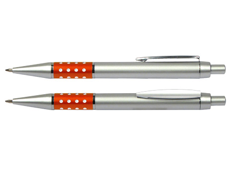 Bolígrafo Plástico Metalizado modelo "Alum", con anillo metálico con orificios. Escritura azul.