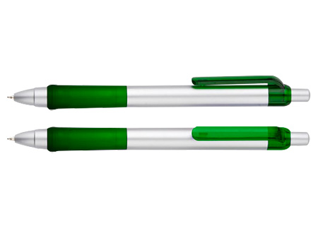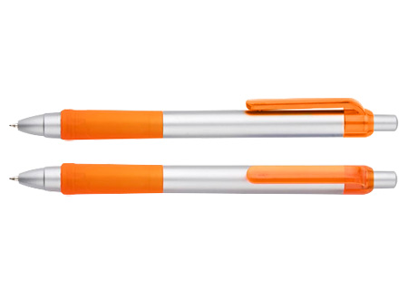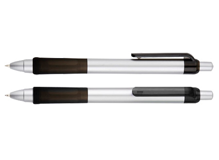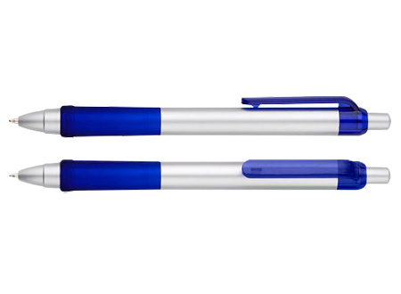 Bolígrafo plástico “Praxis” con cuerpo plateado, grip y clip de color traslúcido. Escritura azul.