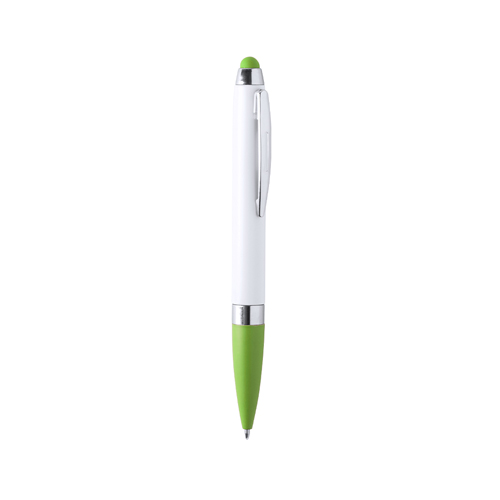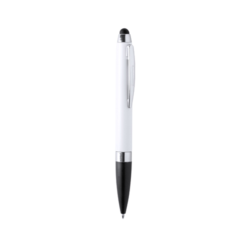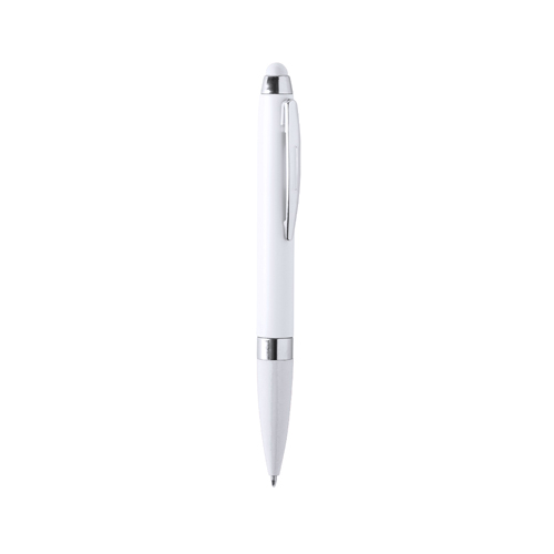 Bolígrafo puntero de colorido diseño, con cuerpo en elegante color blanco sólido. Empuñadura y puntero a juego, con detalles cromados. Tinta azul.