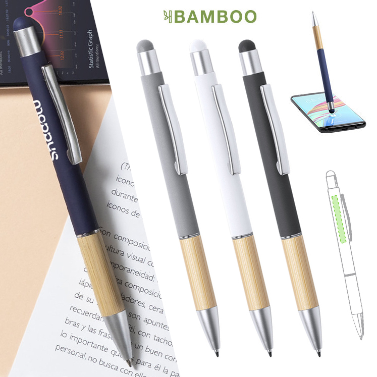 Bolígrafo puntero de línea nature y mecanismo pulsador. De elegante diseño, con cuerpo en aluminio de acabado mate y empuñadura en bambú, con accesorios en acabado mate. Clip metálico y anilla transparente, en tinta azul. Disponible en variada gama de colores.