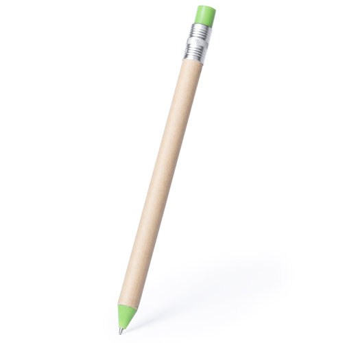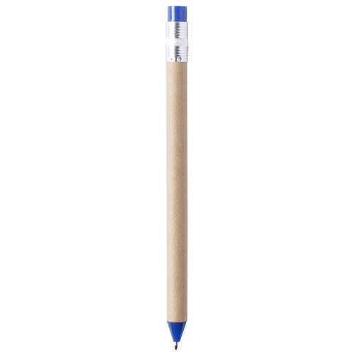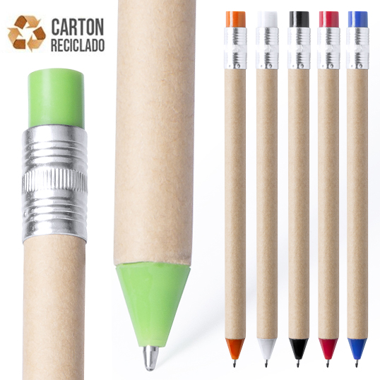 Original bolígrafo de mecanismo pulsador con diseño de lápiz. Combinación de cuerpo en cartón reciclado de color natural y accesorios en vivos colores. Tinta azul.