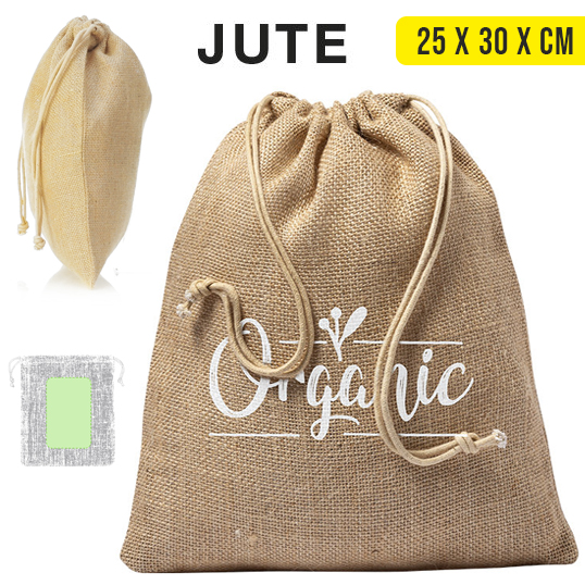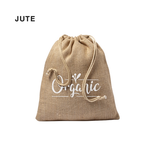 Bolsa de línea nature en resistente yute de 260gsm, con elegante cierre de cordón y acabado cosido.