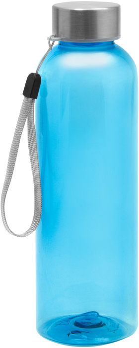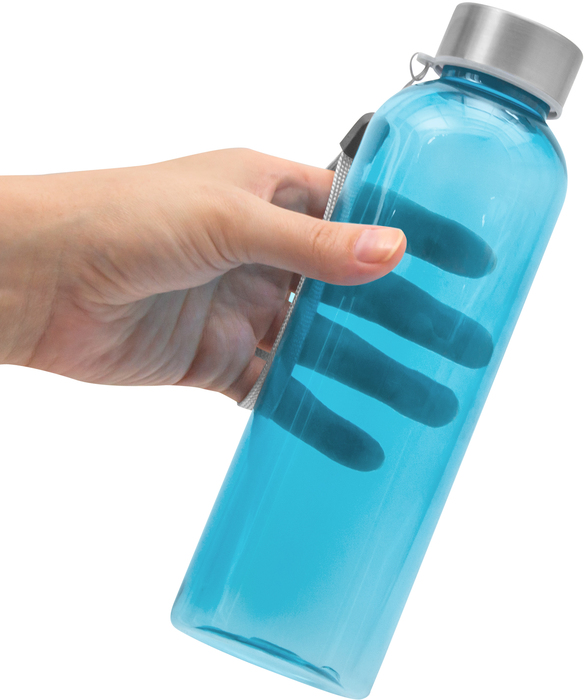 Ø 6,5 x 21 cm. Capacidad 550 ml. Material PET . Botella con tapa de acero inoxidable y correa para transportar.