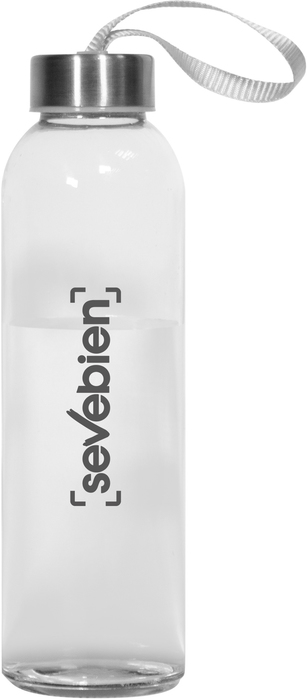 Ø 6,2 x 23 cm. Capacidad 500 ml. Vidrio resistente. Cuerpo traslúcido con tapa de acero inoxidable y tira color gris que permite transportarla. Presentación en caja de regalo.