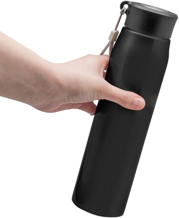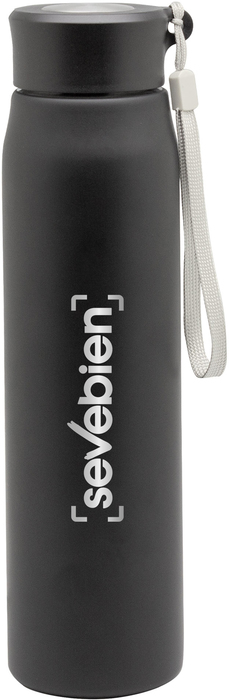 Ø 6,5 x 25 cm. Capacidad 800ml. Acero inoxidable. Botella de acero inoxidable 304. Tapa combinada en plástico y acero inoxidable 201 con tira de color gris de 12 cm de largo. Ideal para llevarla a todos lados. Presentación en caja de regalo.