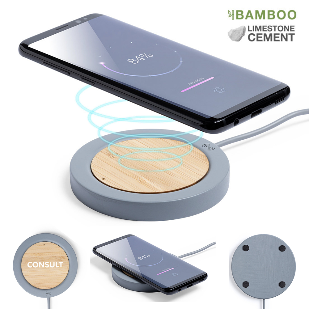 Cargador inalámbrico de diseño circular en combinación de piezas de bambú de corte nature y cemento de piedra caliza, un conglomerante formado por la mezcla de materiales naturales, principalmente piedra caliza molida y agua, obteniendo un material de gran consistencia y durabilidad. Indicador led, cable de carga USB a juego y compatible con dispositivos equipados con tecnología de carga inalámbrica. Protección de seguridad para evitar sobrecalentamiento, sobrecarga y cortocircuito. Presentado en atractiva caja de diseño. Inalámbrico 5W