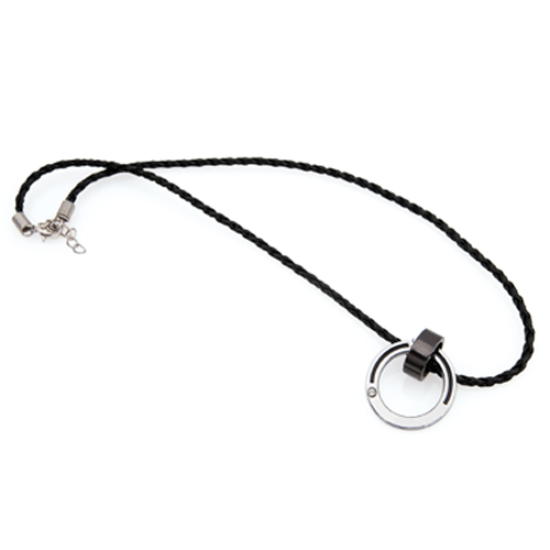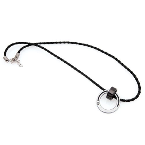 Colgante de polipiel trenzada con cierre de seguridad y accesorio circular en metal brillante para marcaje en láser.