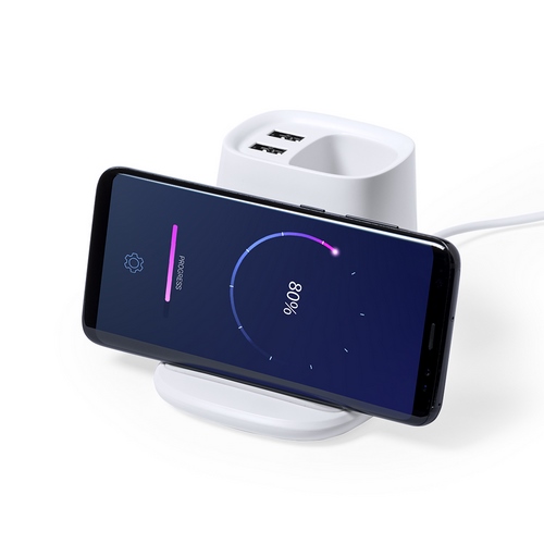 Lapicero multifunción 4 en 1, fabricado en resistente material ABS de color blanco. Con funciones lapicero, soporte para smartphone, cargador inalámbrico 5W y 2 salidas USB de 2.000 mA. Puerto USB inferior, apto para transferencia de datos. Compatible con smartphones con tecnología de carga inalámbrica. Incluye cable tipo C de 1 metro de largo y viene presentado en atractiva caja de diseño. Disponible manual de instrucciones en español e inglés. Inalámbrico 5W. 2 Salidas USB. 1 Puerto USB 2.0