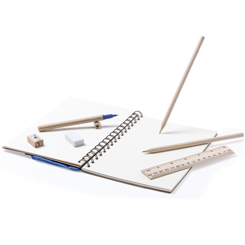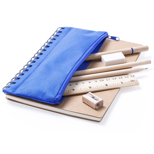 Libreta de anillas con tapas de suave tacto acabadas en resistente cartón reciclado. Con estuche en poliéster 600D de vivos colores y cierre de cremallera integrado en portada. Incluye bolígrafo en cartón reciclado y set de regla, lápices y sacapuntas en madera natural. 70 hojas lisas. Portada Rígida. 70 Hojas. Estuche Incluido. 6 Piezas