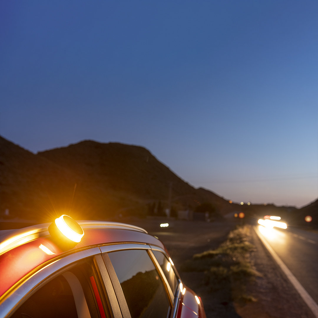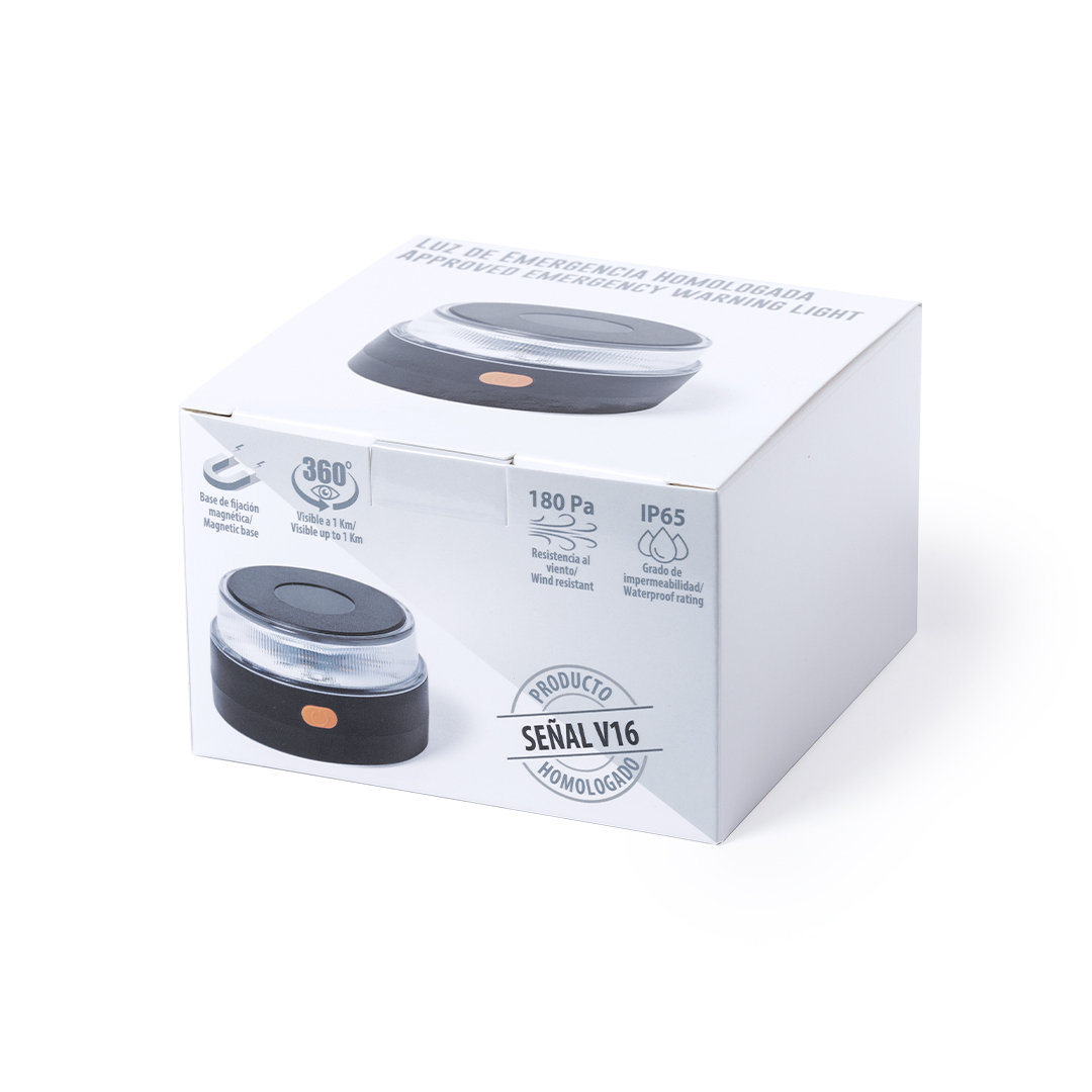 Luz de emergencia homologada V16 para vehículos. Fabricada conforme a la normativa de seguridad vigente y homologada por laboratorio acreditado LCOE, según requisitos de la DGT , con número de homologación marcado en la parte superior del artículo. De activación manual y con base de fijación magnética. Resistencia al viento de hasta 180Pa, visibilidad 360° -hasta 1 km de distancia- y resistencia al agua conforme a estándares IP65. De tamaño compacto para guardar en cualquier compartimento del vehículo y tenerla a mano en caso de emergencia. Presentada en caja individual de diseño. Manual incluido (español e inglés). Alimentación a pilas (3xAA pilas alcalinas incluidas). Banda lateral lisa para impresión. Certificado de Cumplimiento 2021020142G1 emitido por LCOE, conforme a los requisitos de la DGT. 9 Ledes Intermitentes. Magnética. 3 Pilas AA Incluidas