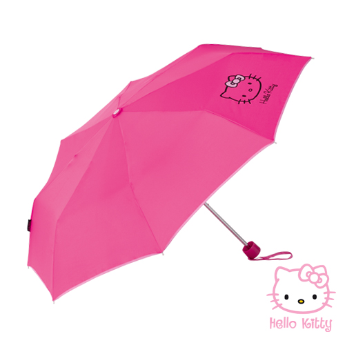 Paraguas plegable de Hello Kitty de 8 paneles en divertido diseño fucsia con gatita de la marca, de 98cm de diámetro con apertura manual. En resistente poliéster, con varillas metálicas en color plateado, cinta de transporte en mango y presentado en funda del mismo material con gatita de la marca. 21″”. Funda Poliéster