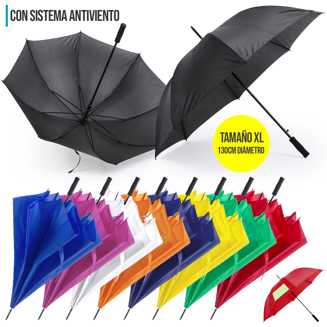 Paraguas de 8 paneles tamaño XL -130cm diámetro- con sistema antiviento. Apertura automática, en resistente poliéster y con varillas de fibra en color negro. Con mango acolchado de EVA y cierre de velcro. Disponible en extensa gama de colores. 30″”. Automático. Sistema Antiviento. Mango EVA