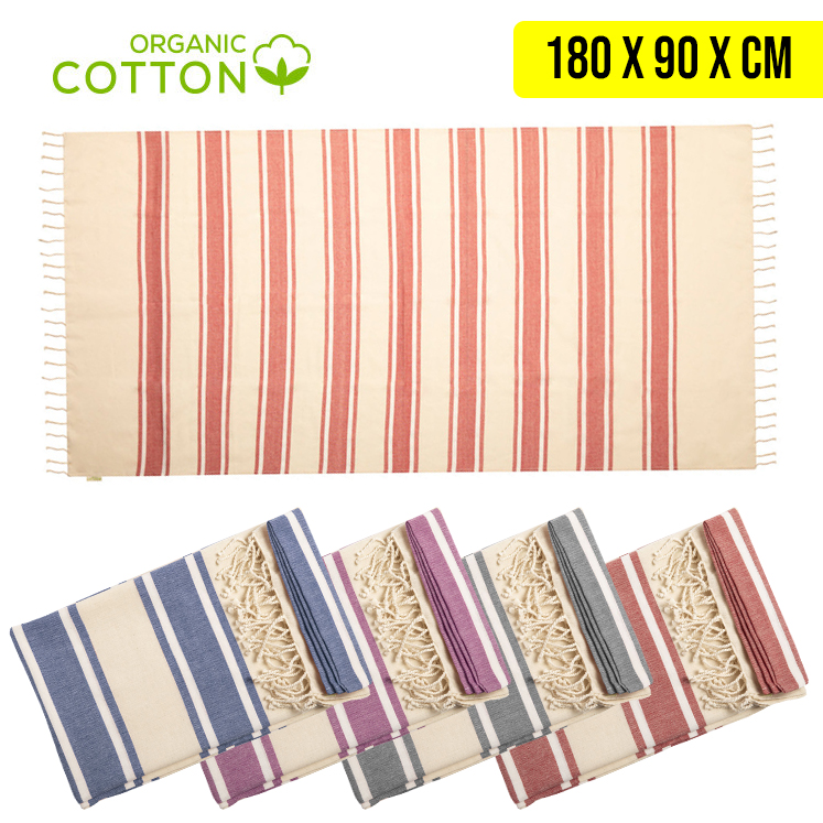 Pareo toalla 2 en 1 en algodón orgánico de 110g/m2. Tamaño 180 x 90 cm y disponible en variada gama de colores combinados. Distintivo organic en etiqueta. *Para pedidos con impresión, se debe incrementar el coste del marcaje + 0,20 / unidad en concepto manipulación especial*
