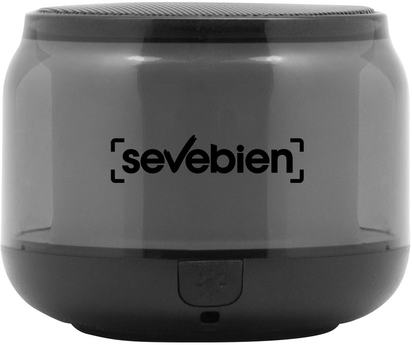 Ø 7,5 x 6 cm. Parlante Bluetooth estéreo. ABS transparente con cubierta de malla metálica por donde se emite el sonido. Botones en color negro. Led que cambia entre 7 colores y 8 modos de luz para elegir. Potencia 3W. Versión Bluetooth: 5.0. capacidad de la batería: 500 mAh. Cable de carga y conexión USB-C en color negro. Presentación en caja de regalo.