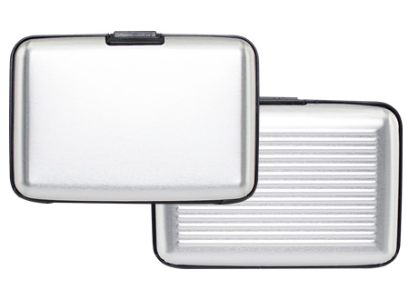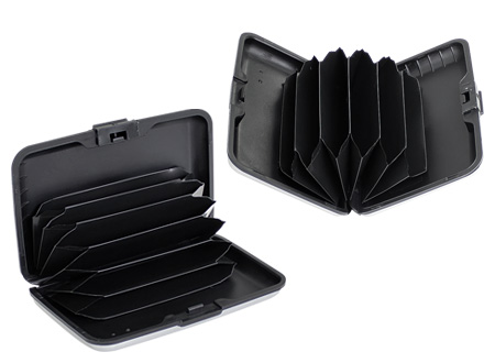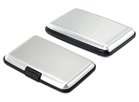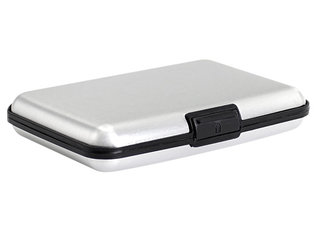 Estuche rígido Porta-Tarjetas (tamaño Tarjeta de Crédito) con protección anti-clonación o Escaneo RFID. Capacidad interior para 6 Tarjetas. Presentación en bolsa de polipropileno y Estuche plateado de Regalo.