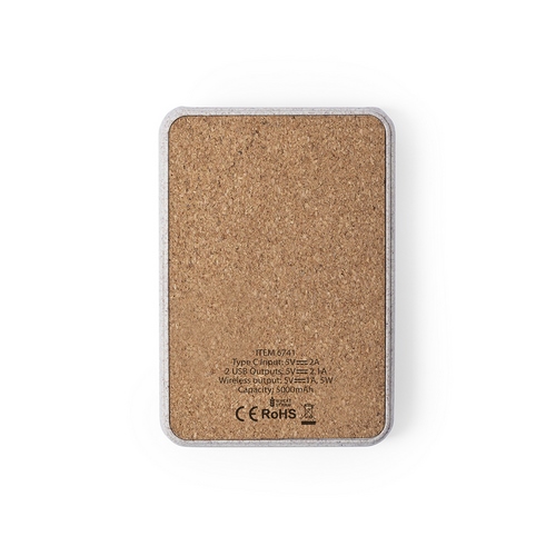 Batería auxiliar externa de línea nature con cargador inalámbrico 5W integrado. Carcasa en combinación de materiales corcho natural y caña de trigo. 5.000 mAh de capacidad e indicador de estado de carga. Doble salida USB y entrada Tipo C. Con amplia superficie de marcaje y presentado en atractiva caja de diseño eco. Las capacidades mostradas en todas nuestras baterías auxiliares externas son reales, incorporando todas ellas baterías de grado A y no recicladas, con una vida útil de al menos 500 ciclos de carga y según normativa CE. Además, están fabricadas conforme a los estándares RoHS y en cumplimiento con los siguientes requisitos de seguridad: Sistema de protección contra sobrecarga del power bank. Sistema de protección contra descarga completa que proporciona una mayor durabilidad del power bank. Sistema de bloqueo para evitar cortocircuitos. Sistema de transferencia de carga constante, acorde con la capacidad del dispositivo de destino. Inalámbrico 5W. 5000 mAh. 2 Salidas USB. Entrada Tipo C