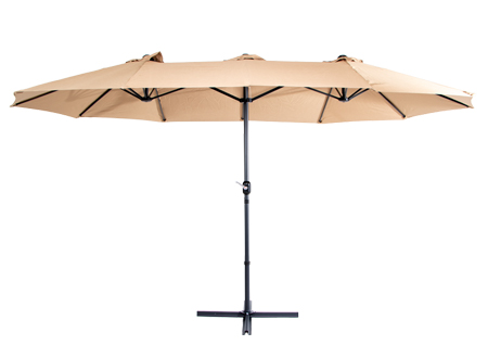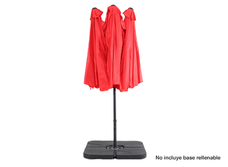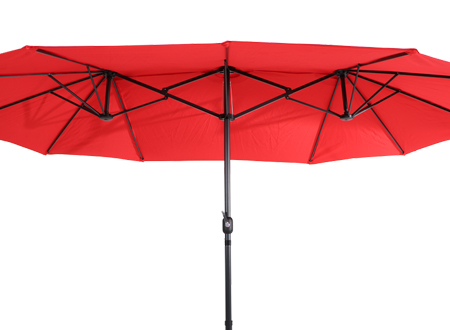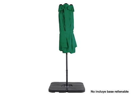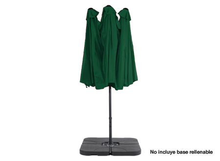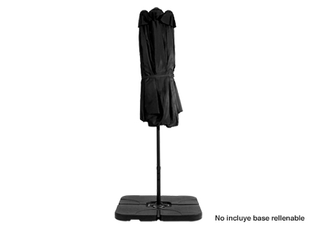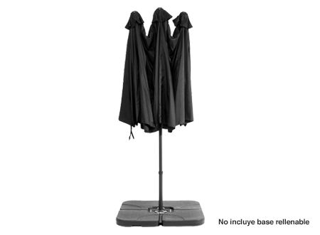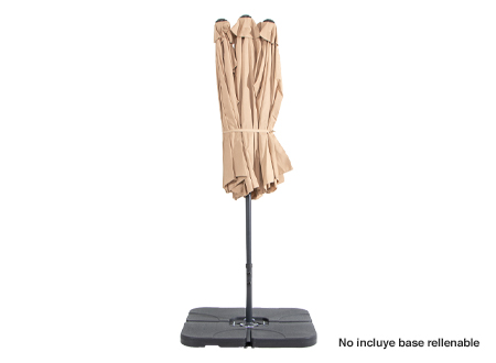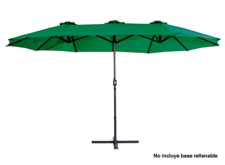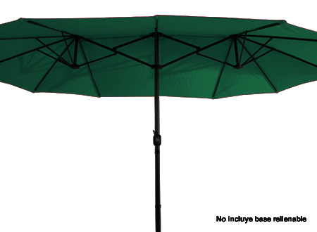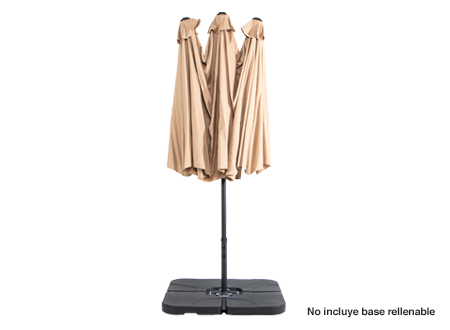 Quitasol ovalado doble de 4.55 x 2.7 m, modelo “Twins”, con 12 cascos de lona Poliéster UV impermeable de 180g. Contiene varas reforzadas de Acero recubierto de 12 x 18mm, asta de Acero recubierto de 48mm, sistema de apertura automático con manivela.