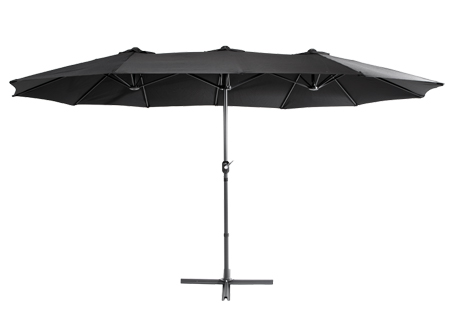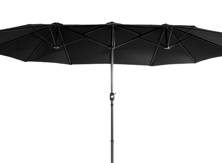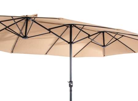 Quitasol ovalado doble de 4.55 x 2.7 m, modelo "Twins", con 12 cascos de lona Poliéster UV impermeable de 180g. Contiene varas reforzadas de Acero recubierto de 12 x 18mm, asta de Acero recubierto de 48mm, sistema de apertura automático con manivela.