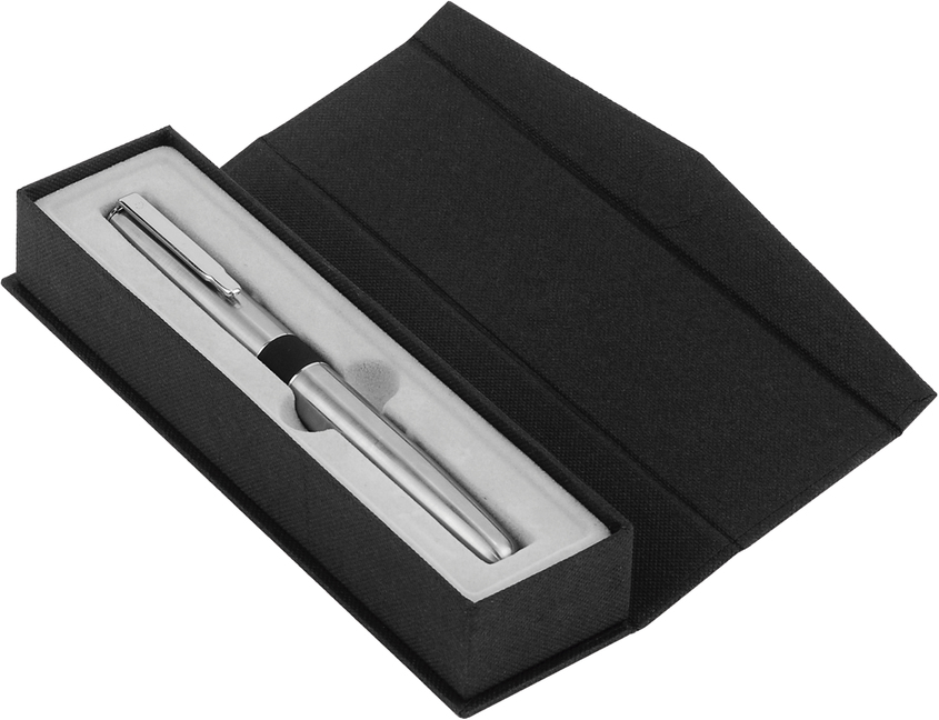 Metal. Roller. Cuerpo metálico. Clip y detalles color negro. Tinta gel negro. Estuche con cierre magnético. Área de impresión: Ø 0,8 x 5 cm. Presentación en estuche con cierre magnético.