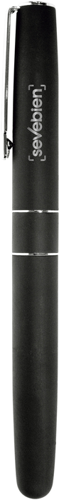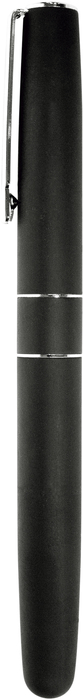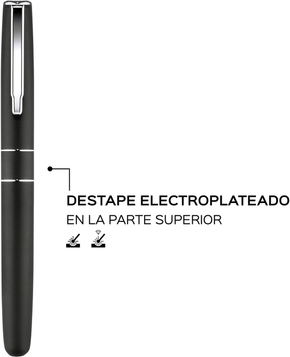 Metal. Cuerpo metálico engomado. Clip y detalles color plata. Tinta gel negro. Decape electroplateado en la parte superior. Estuche con cierre magnético. Área de impresión: Ø 0,8 x 5 cm. Presentación en estuche con cierre magnético.