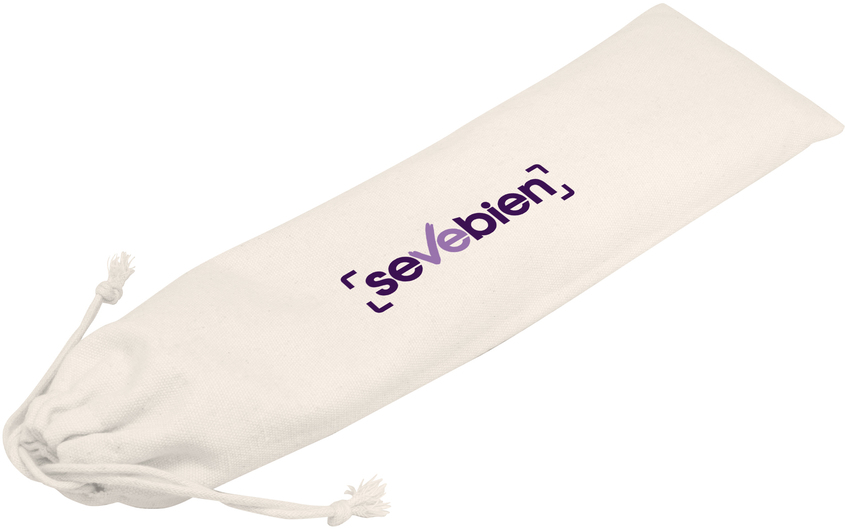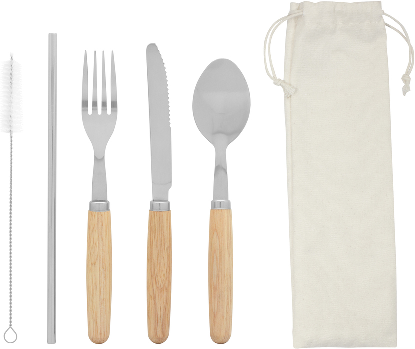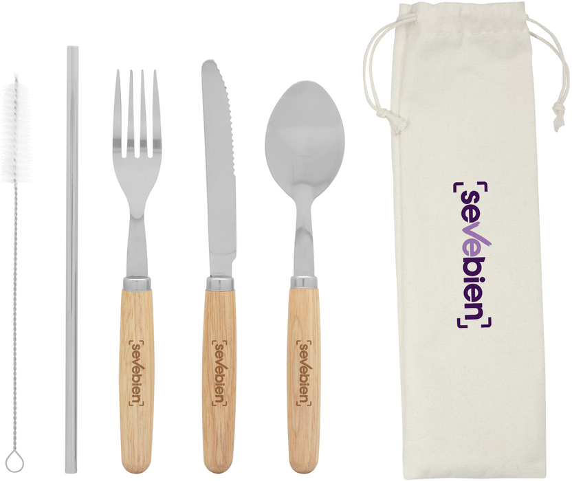Acero Inoxidable 420. Set de cubiertos. 5 elementos: bombilla, cepillo para bombilla, cuchara, tenedor y cuchillo. Mango de madera para los 3 cubiertos. Todo el set está contenido en un estuche de canvas color crudo. Presentación en caja de regalo Kraft.
