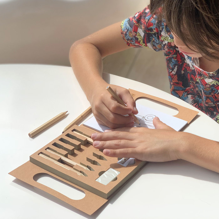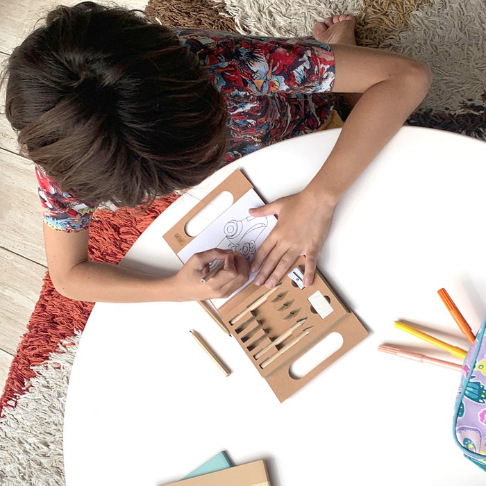 14,5 x 14,5 x 1,8 cm (cerrado). Papel madera reforzado. Set de papel madera reforzado con manija para colorear y llevar a todos lados. Trae 6 lápices de madera en diferentes colores (negro, marron, verde, azul, rojo y amarillo). 30 hojas con diseños varios para colorear. 1 goma de borrar y 1 sacapuntas.