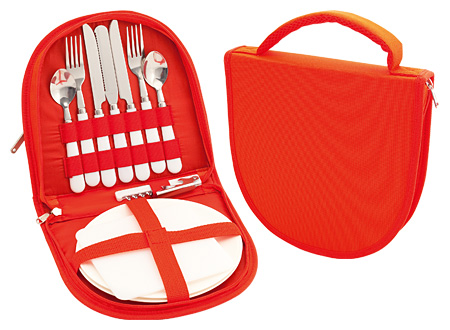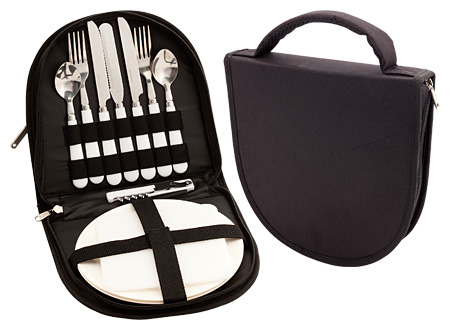 Set de Picnic para 2 personas en bolso raquelado con mango. Incluye set de cubiertos (cuchillos, tenedores y cucharas), 2 platos de melamina blanca, 1 tabla para cortar y 1 herramienta multiuso con destapador, descorchador y cortaplumas.