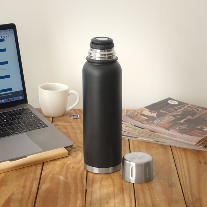 Ø 8,4 x 30 cm. Capacidad 1000 ml. Acero inoxidable. Termo Doble pared con recubrimiento de cobre. Interior en acero 304 y exterior en acero 201. Pintura Powder Coat (pintura mas duradera y resistente a la corrosión y el paso del tiempo). Tapa de acero a rosca. Tapón con apertura y cierre a presión. Mantiene por más de 12 hs la temperatura de las bebidas calientes y 24 hs de las bebidas frías. Presentación en caja de regalo.