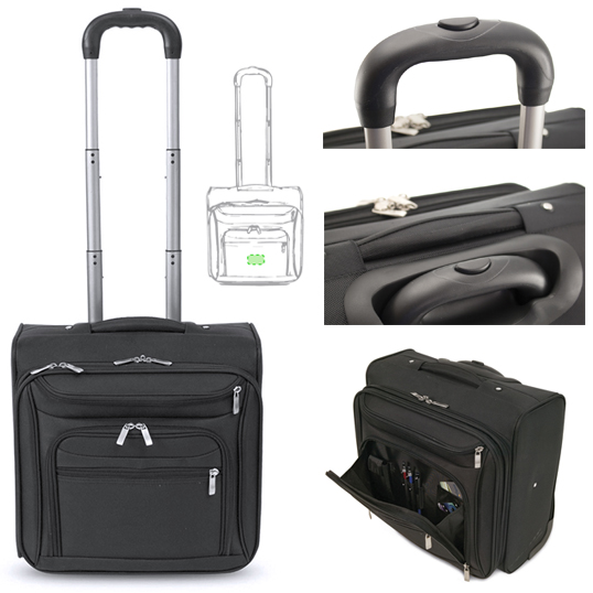 Trolley de negocios multibolsillo de 2 ruedas acabado en resistente poliéster 1200D. De elegante color negro, con asa exterior reforzada a juego, cremalleras con orificio para candado -incluido- y prácticos bolsillos en parte frontal. Con identificador, cierre de seguridad de combinación numérica y cremalleras a juego, incluye además compartimento interior acolchado para ordenador portátil de hasta 17 pulgadas y multitud de bolsillos y fundas para bolígrafos interiores. Bolsillo Acolchado para Portátil. Candado Metal Incluido