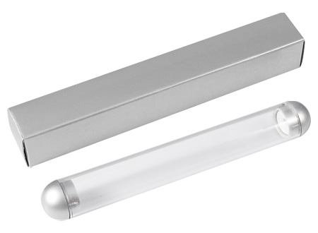 Tubo de Acrílico traslúcido para 1 bolígrafo. Tapas plateadas con superficie redondeada. No incluye Bolígrafo.